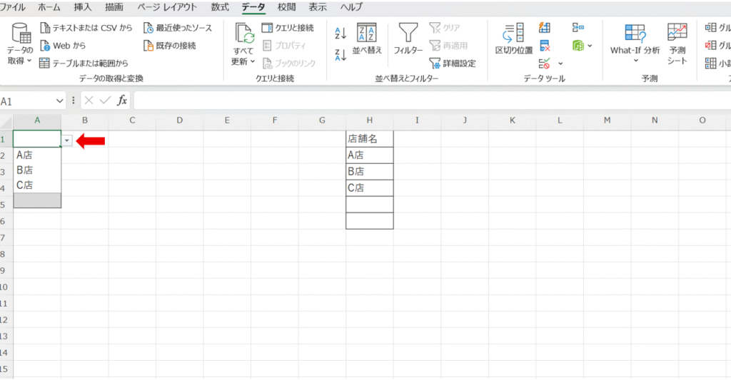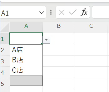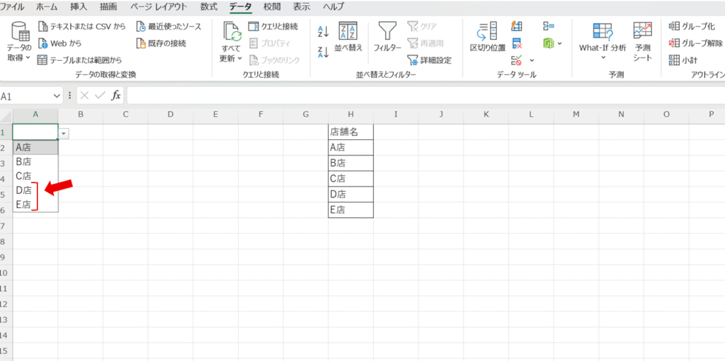 リストを更新することで、ドロップダウンリストにD店とE店が、自動で追加表示されます。