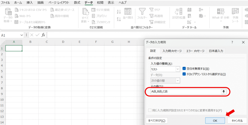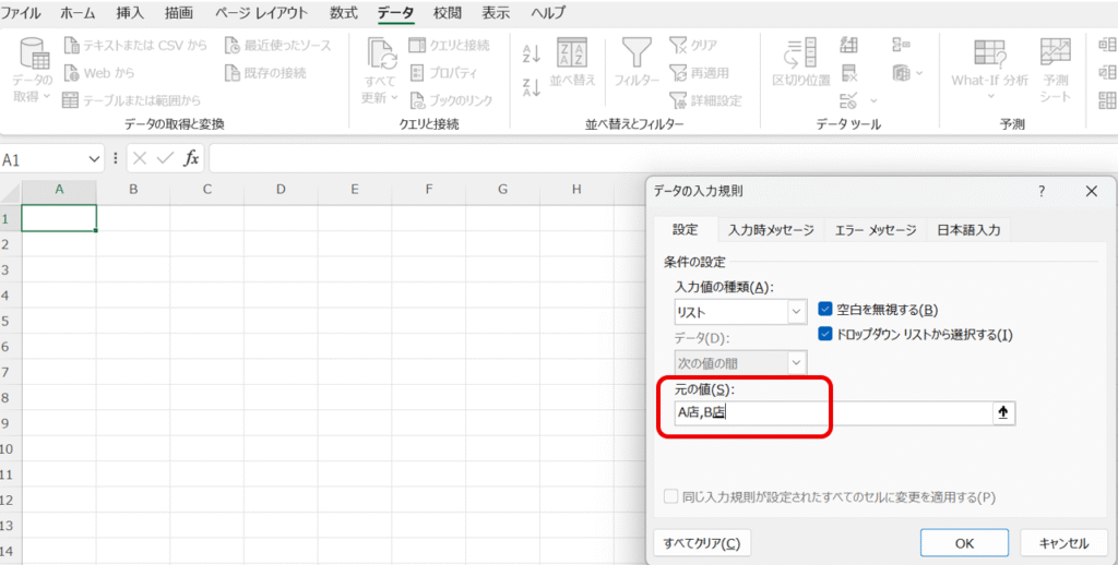 ①エクセルでドロップダウンリストを作りたいセルを選択