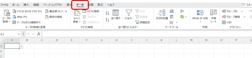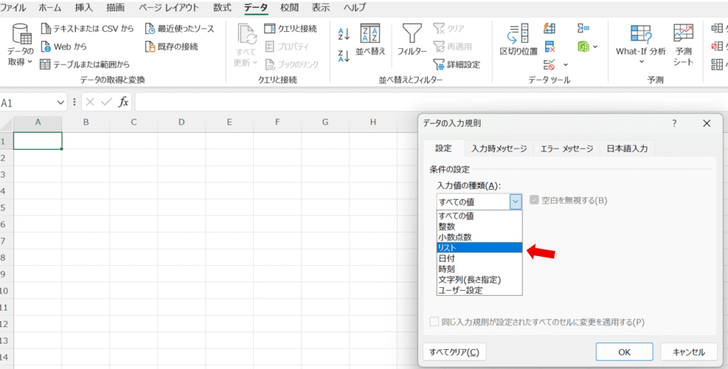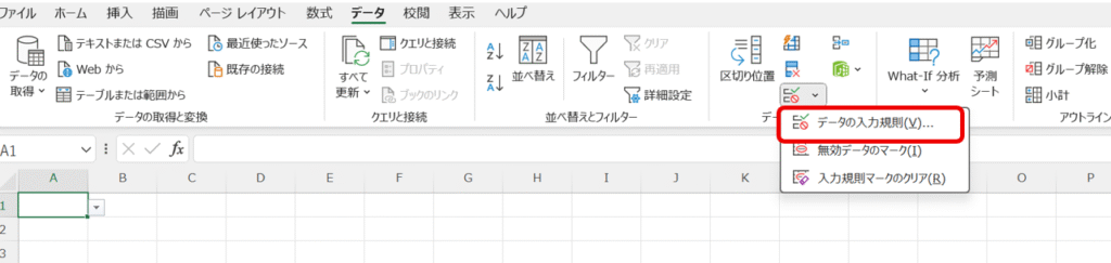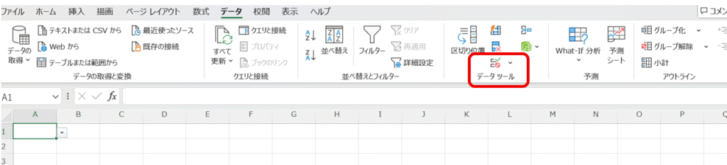 ずばり、ドロップダウンリストは、エクセルの上部(リボン)のデータタブ、データツール内「データの入力規則」から作成することができます。