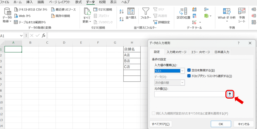 ⑦リストを選択後、元の値入力欄右端にある「矢印上マーク」を選択
