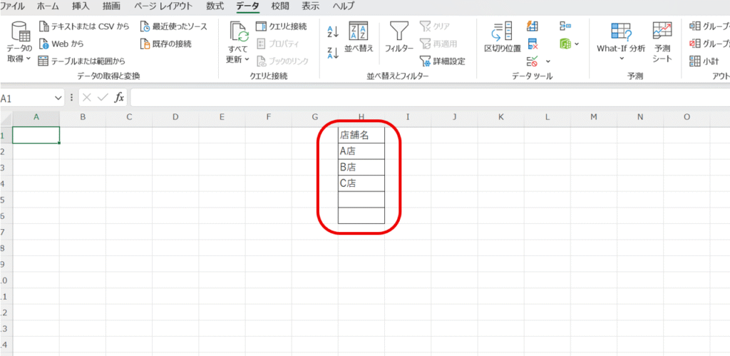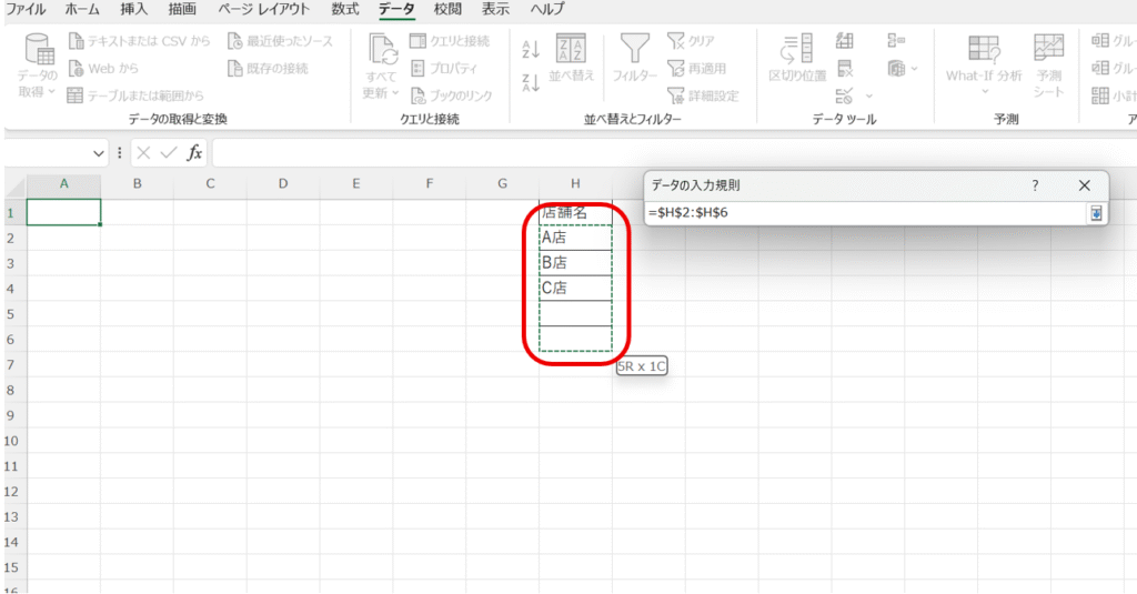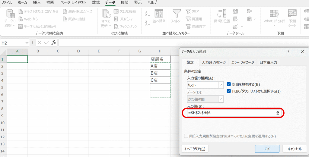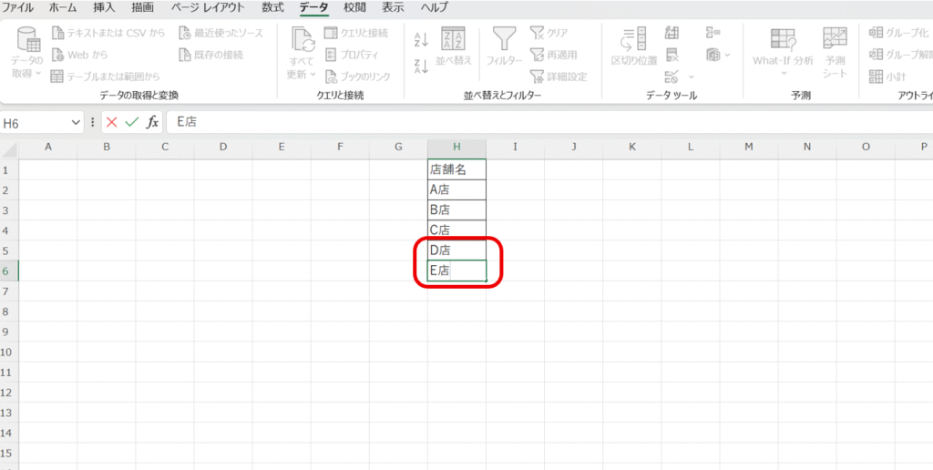 空欄にしていたH5に「D店」、H6に「E店」の店舗を入力