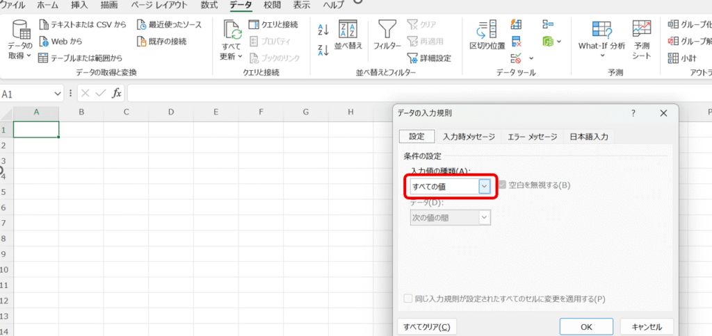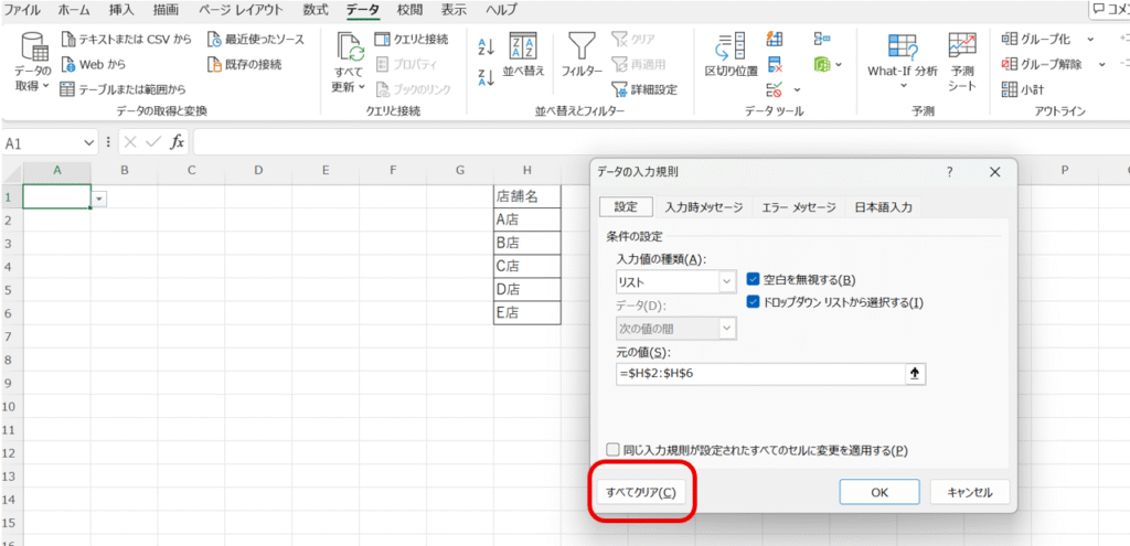 データツール内のデータの入力規則で「すべてクリア」を選択し「OK」を押す