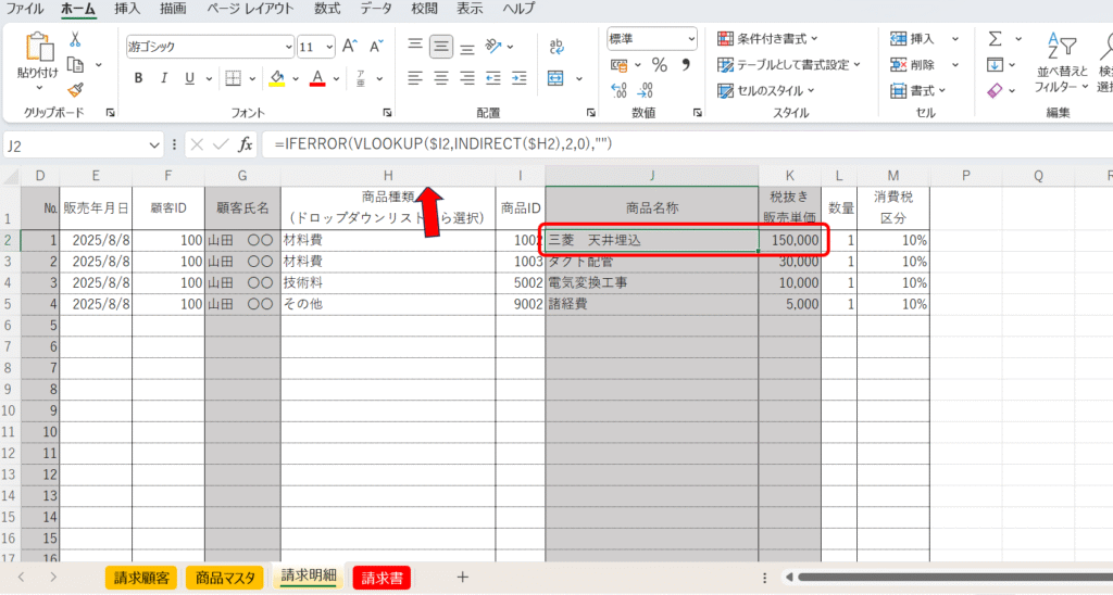 J2セルのVLOOKUP($I2,INDIRECT($H2),2,0)により、H列のドロップダウンリストを選び、商品IDを入力すると、商品マスタシートの商品名称が表示されます。