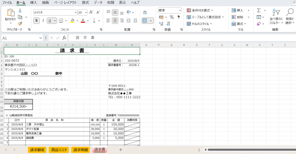 まずは、完成した請求書はこちら。(全体プレビューではないことご容赦ください)