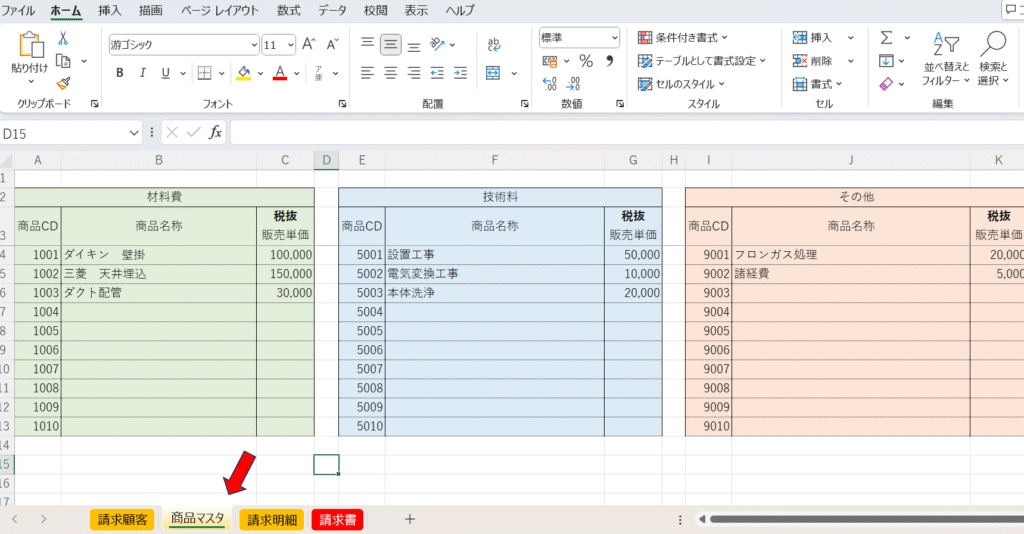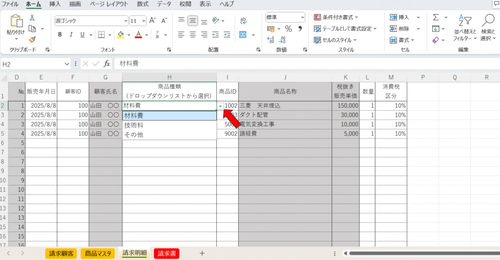 「請求明細シートのH列」で使うドロップダウンリストは、ニ行目の商品種類名と合わせています。(材料費,技術料,その他)