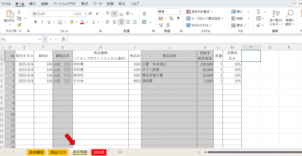 さらに、請求顧客シートに顧客情報を入力してもらうことで、基礎データが完成します。