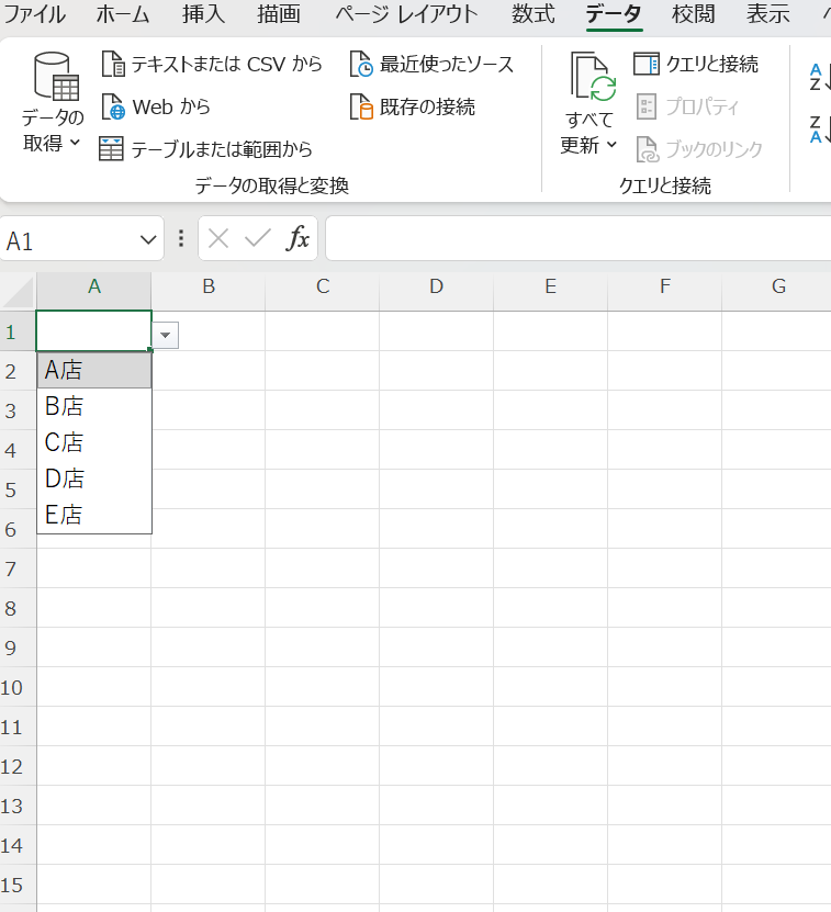 リストを更新することで、ドロップダウンリストにD店とE店が、自動で追加表示されます。