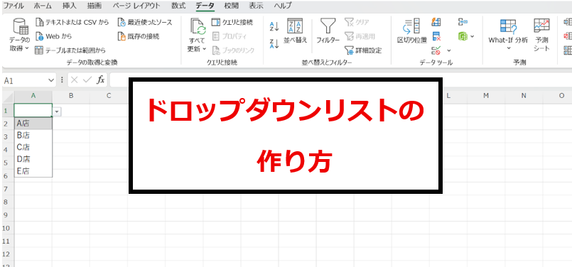 ずばり、ドロップダウンリストは、エクセルの上部(リボン)のデータタブ、データツール内「データの入力規則」から作成することができます。