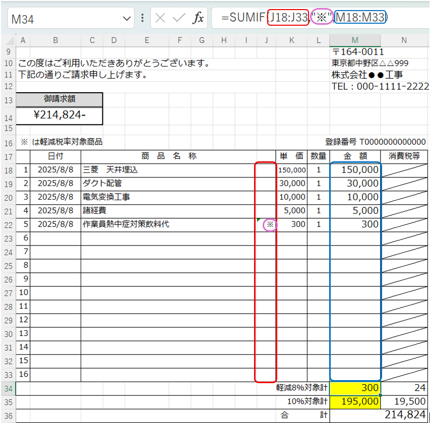 M34セルに作ったSUMIF関数は、SUMIF(J18:J33,”※”,M18:M33)となります。