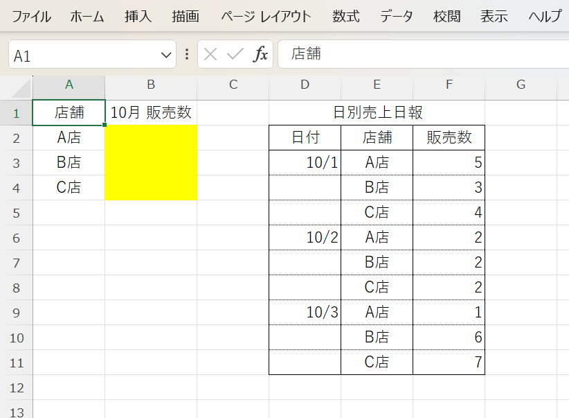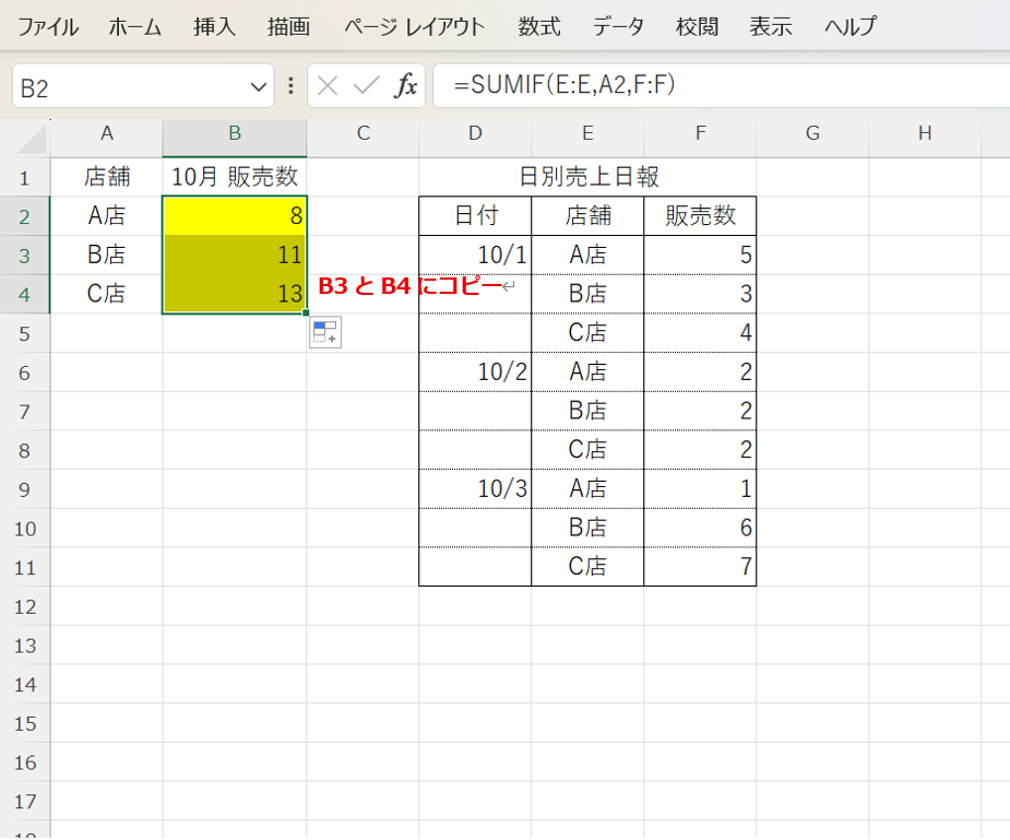 例えば「B2~B4セル(黄色の箇所)にA列の各店販売数を日別売上日報から集計したい」という目的にした場合、B2~B4セルにSUMIF関数を作成します。