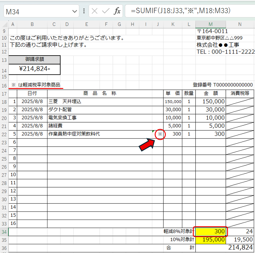 ・M34セル(赤枠)にSUMIFを使用し軽減8%対象商品の金額を集計