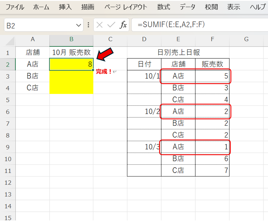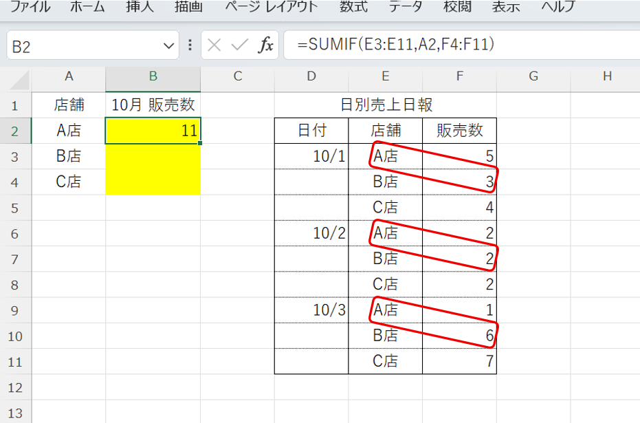 日別売上日報に記載された、A店の販売数(赤枠の箇所の合計)がB2セルにしっかり集計されています。