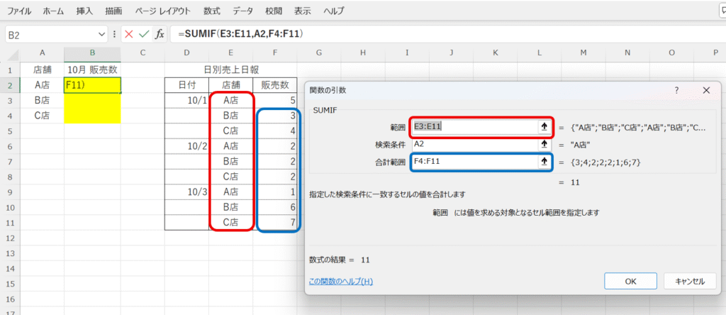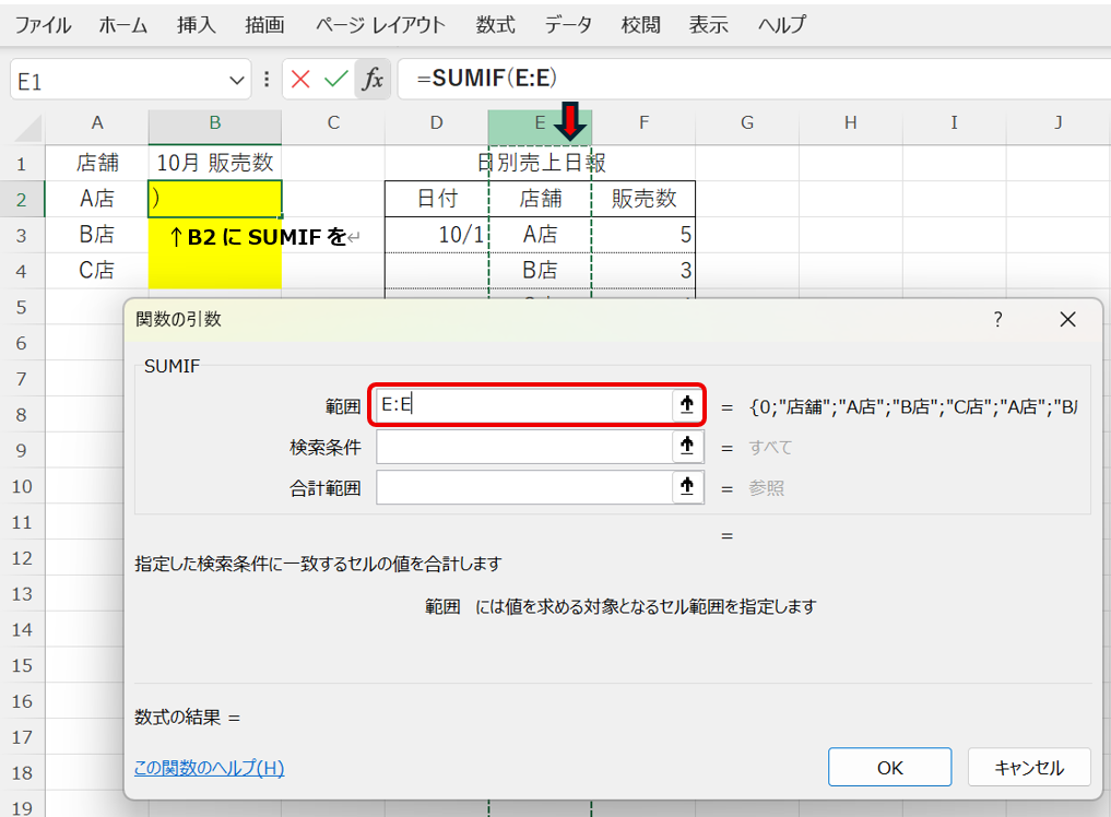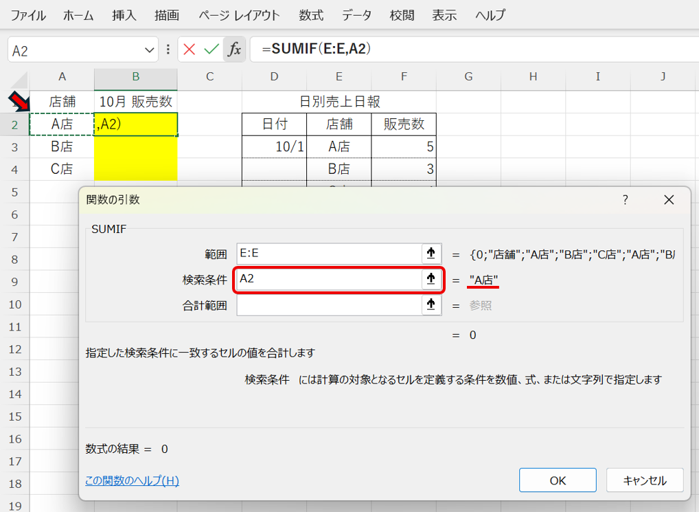 下の画像でいえば、E列から販売数の集計の元になる店舗名である”A店”を見つけてほしいので、記載されているA2セルを指定します。