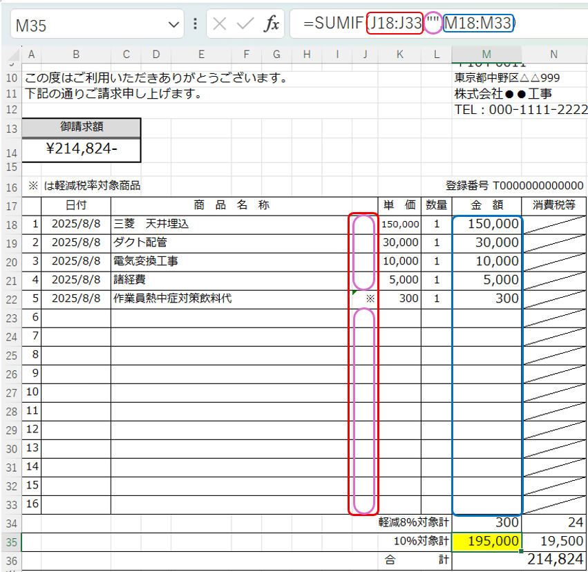 M35セルに作ったSUMIF関数は、SUMIF(J18:J33,””,M18:M33)となっています。