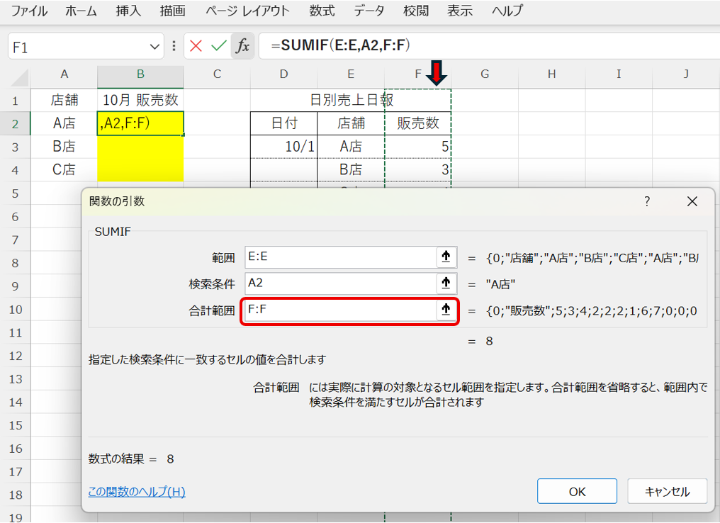 販売数を集計したいので日別販売日報の販売数が記載された”F列”を指定します。