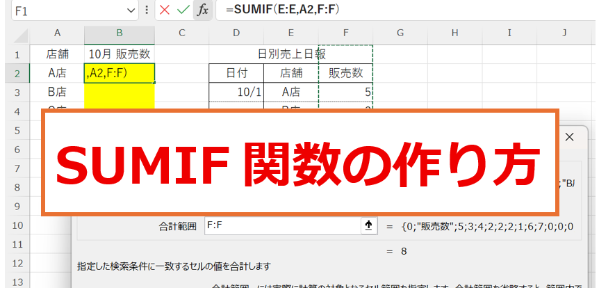 下の画像でいえば、E列から販売数の集計の元になる店舗名である”A店”を見つけてほしいので、記載されているA2セルを指定します。